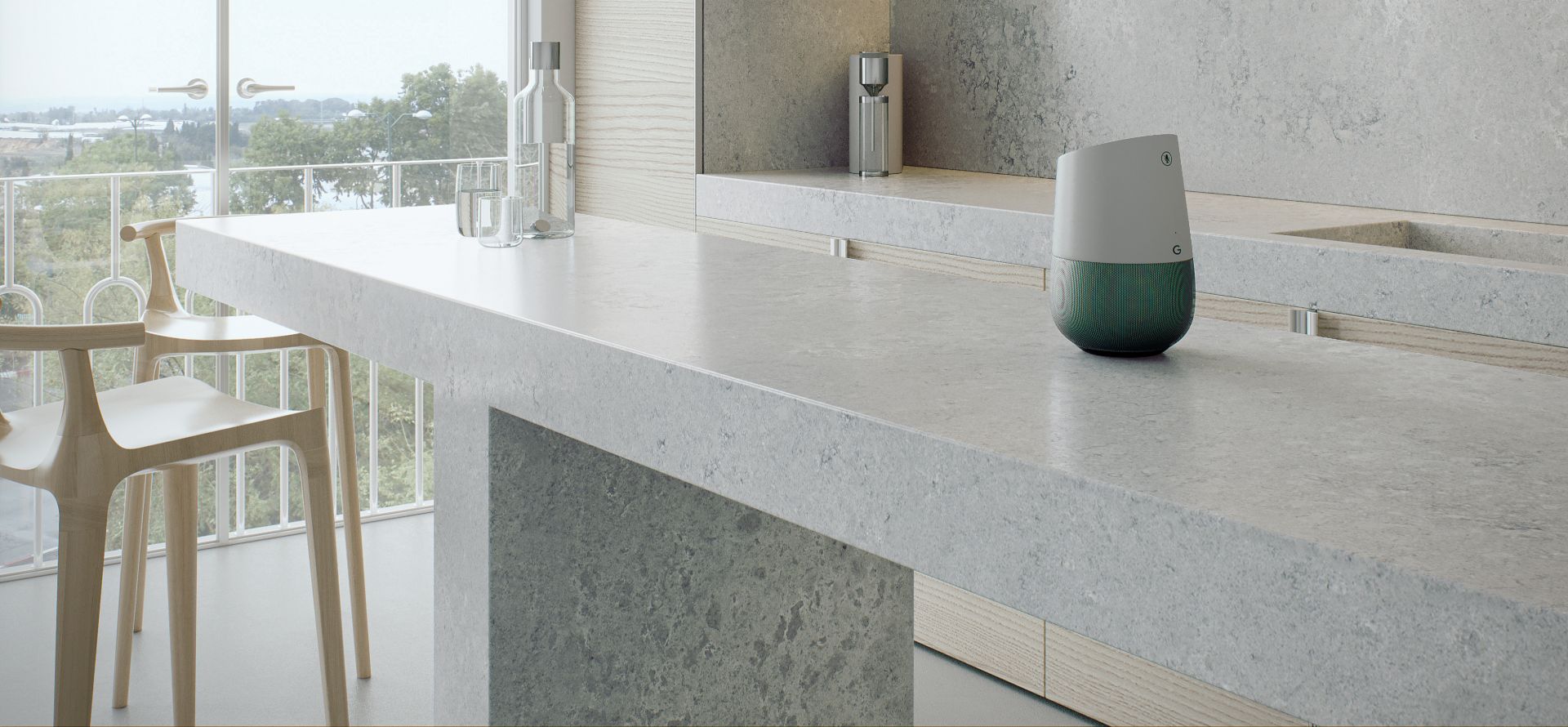 Airy Concrete (Rough) är en ljusgrå kvarts i Metropolitan-kollektionen som fångar känslan av äkta betong i full rörelse. Ytan virvlar med moln av mörkare nyanser och vita blixtar över den djupt texturerade strukturen som är förfinad för hemmet.