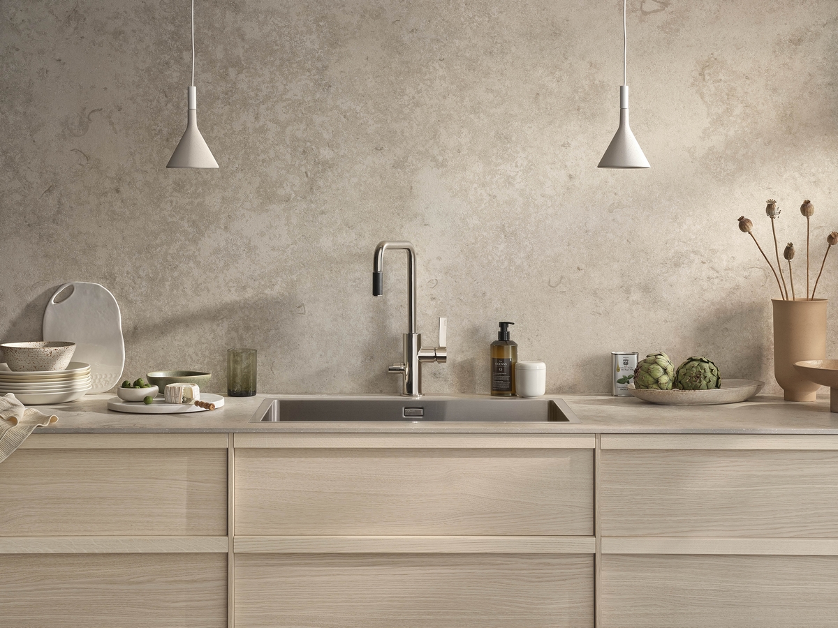 En slipad yta är också helt slät, men till skillnad från den polerade ytan har den en matt eller sidenmatt finish. Den reflekterar ljuset mjukt och diffust, vilket ger ett lugnare, mer dämpat och naturligt intryck. Slipade ytor är ofta mer förlåtande mot vardagligt slitage; fingeravtryck, damm och mindre repor tenderar att synas mindre tydligt. Den upplevs generellt som lättare att underhålla än en polerad yta.