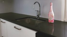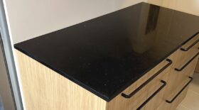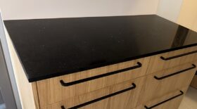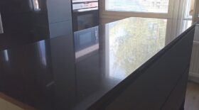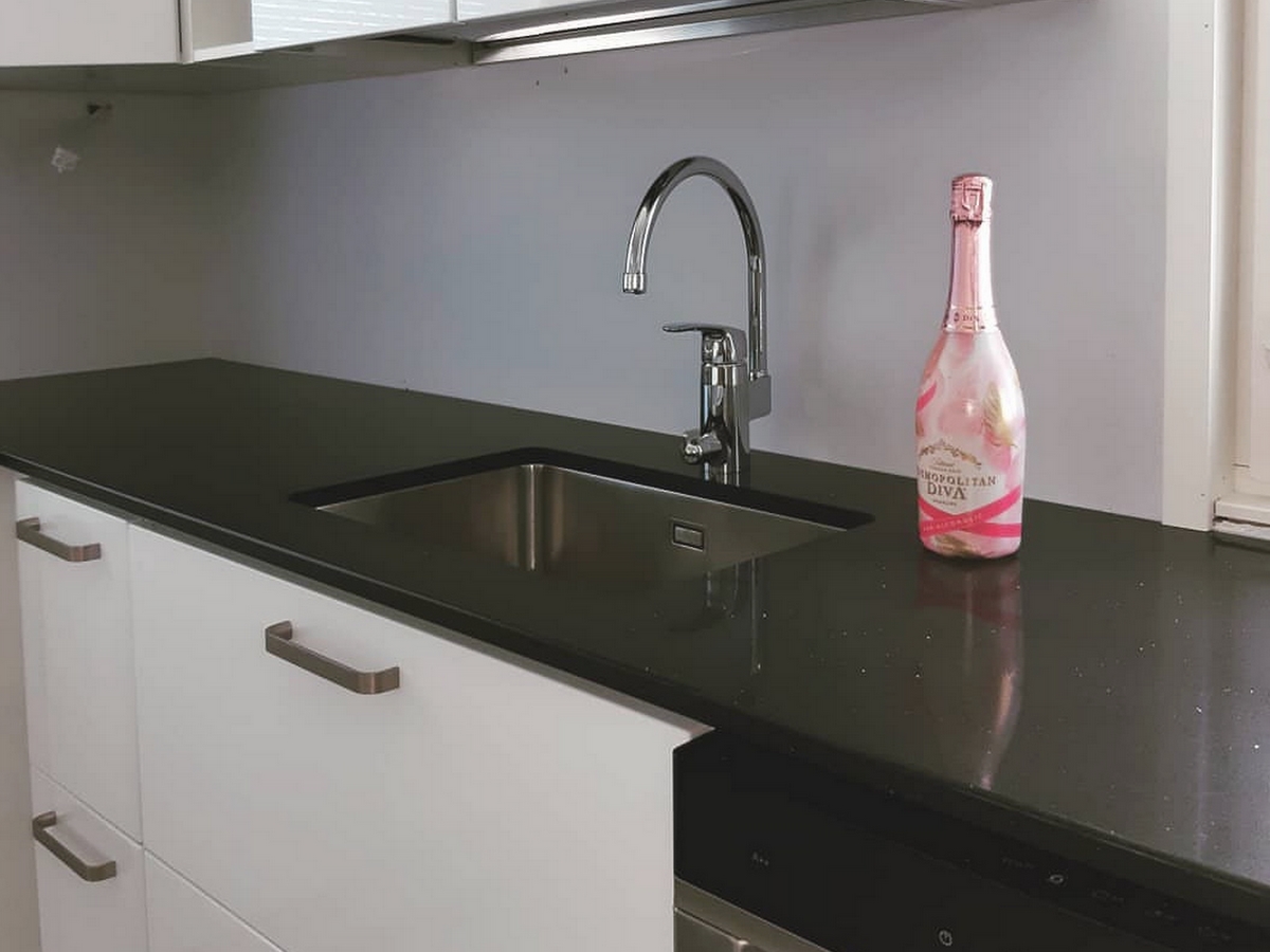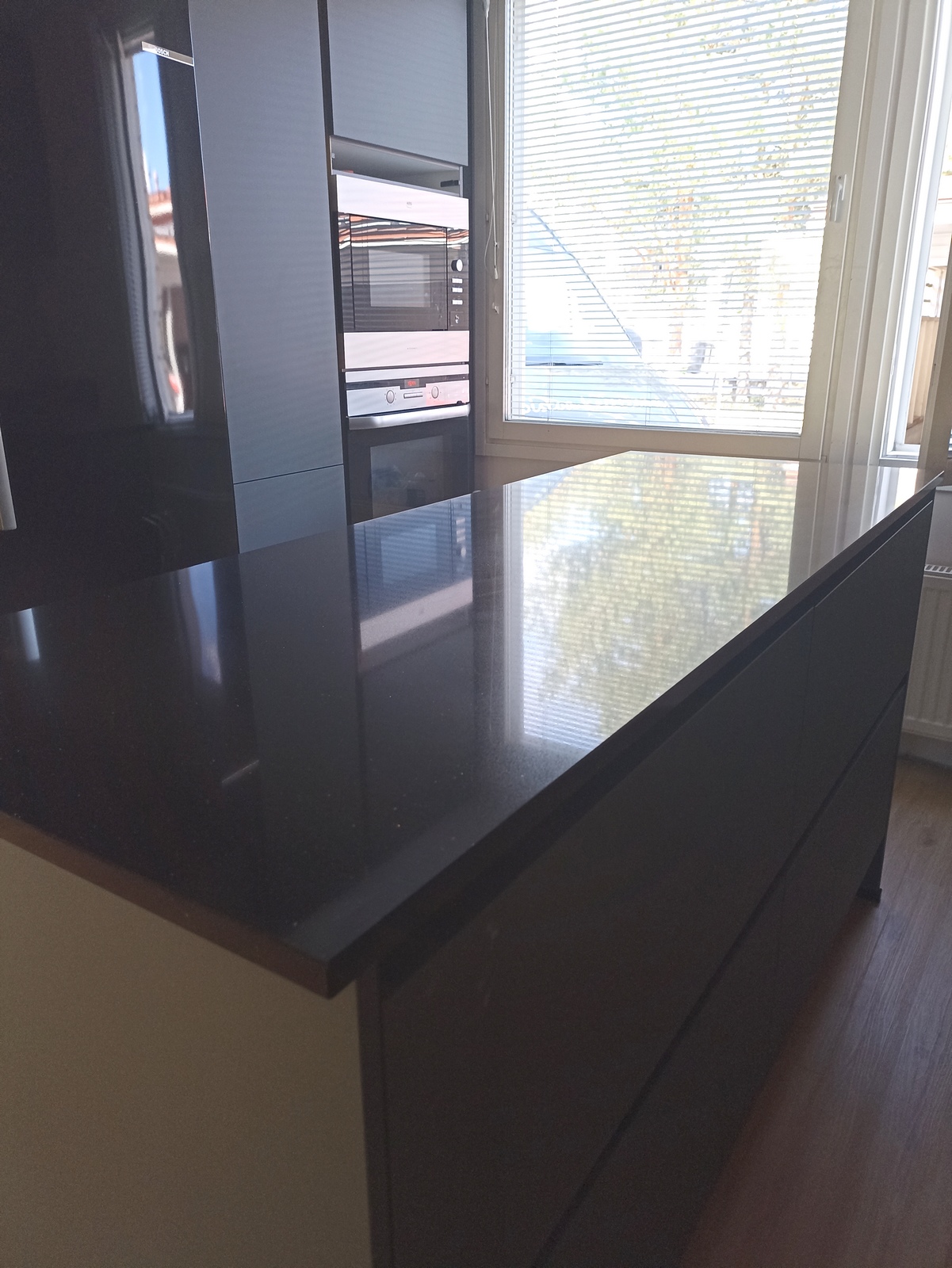 Brilliant Black är kvartskomposit med framträdande kristaller på mörk bakgrund. Den pietetsfullt mörka bänkskivan livas upp av glimrande prickar och mörka spegelbitar. En bänkskiva i kompositsten är ett konstverk!