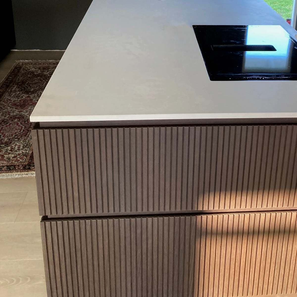 En slipad yta är också helt slät, men till skillnad från den polerade ytan har den en matt eller sidenmatt finish. Den reflekterar ljuset mjukt och diffust, vilket ger ett lugnare, mer dämpat och naturligt intryck. Slipade ytor är ofta mer förlåtande mot vardagligt slitage; fingeravtryck, damm och mindre repor tenderar att synas mindre tydligt. Den upplevs generellt som lättare att underhålla än en polerad yta.