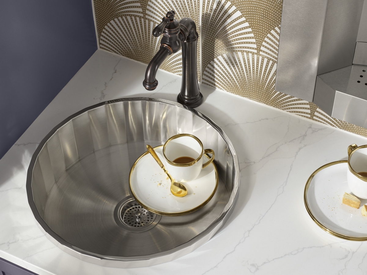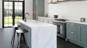 Eternal Calacatta Gold är inspirerad av den berömda italienska Calacatta-marmorn. Under senare år har bänkskivor av kompositsten (även kallat kvartssten eller konststen) blivit alltmer populära i formgivna kök. Kvarts består av ca 93 % naturlig kvartssand och resten är bindemedel, färgämnen och tillsatser för att förbättra de tekniska egenskaperna. Bänkskivor av kompositsten står bättre emot mekaniska, termiska och kemiska effekter än natursten. En kompositbänkskiva är därför ett bra val för den som vill ha en så underhållsfri och hållbar köksbänk som möjligt.