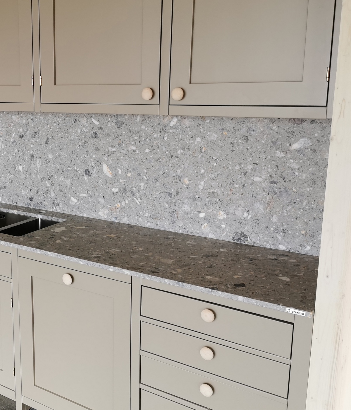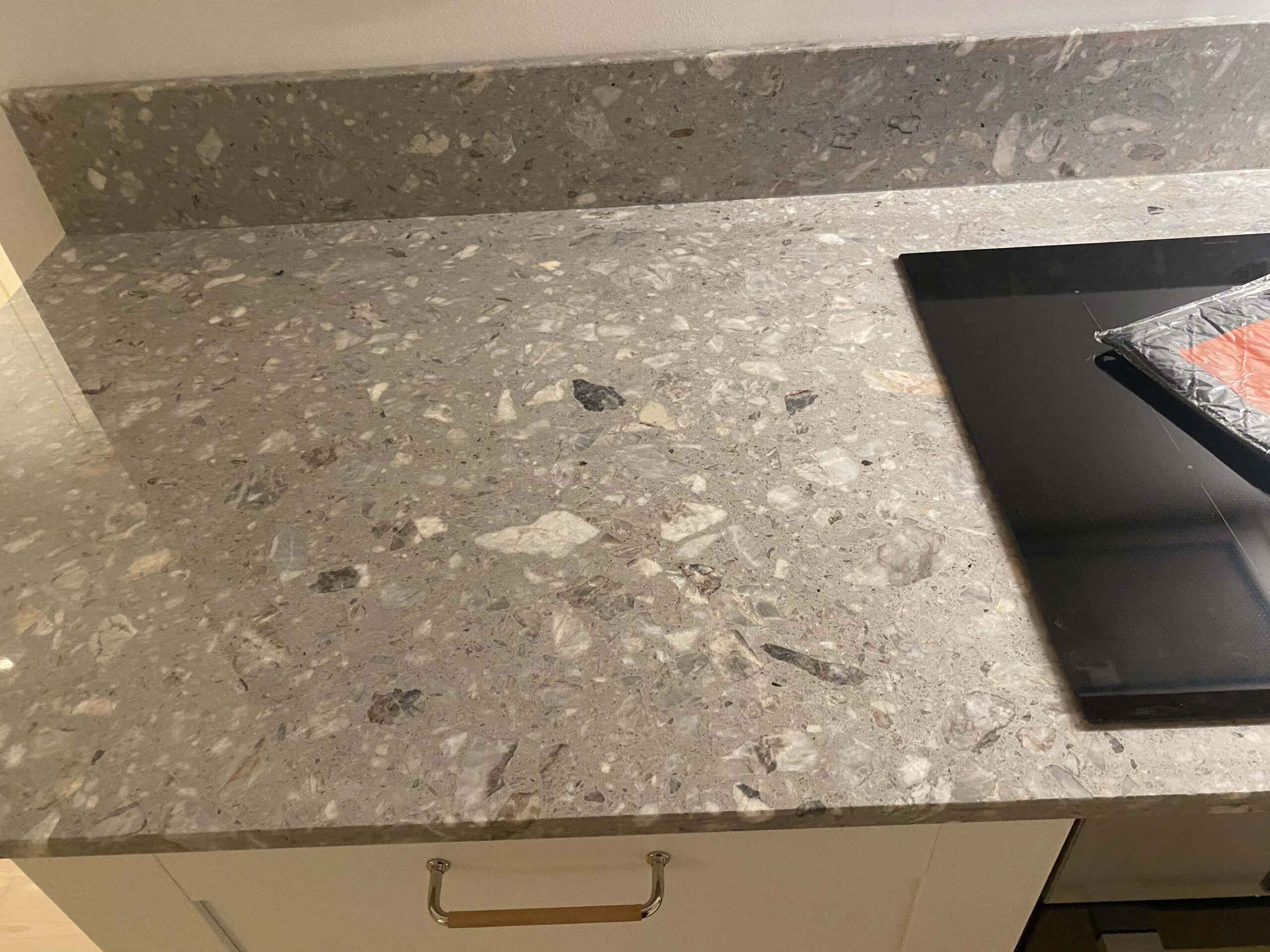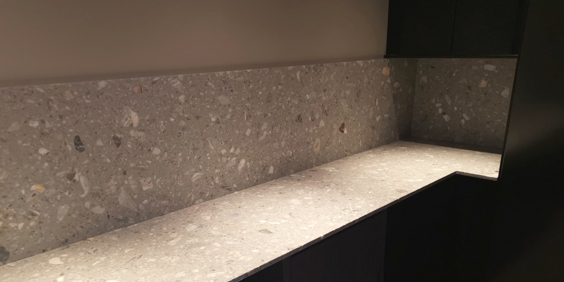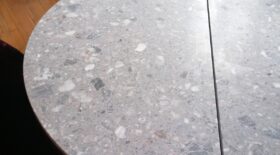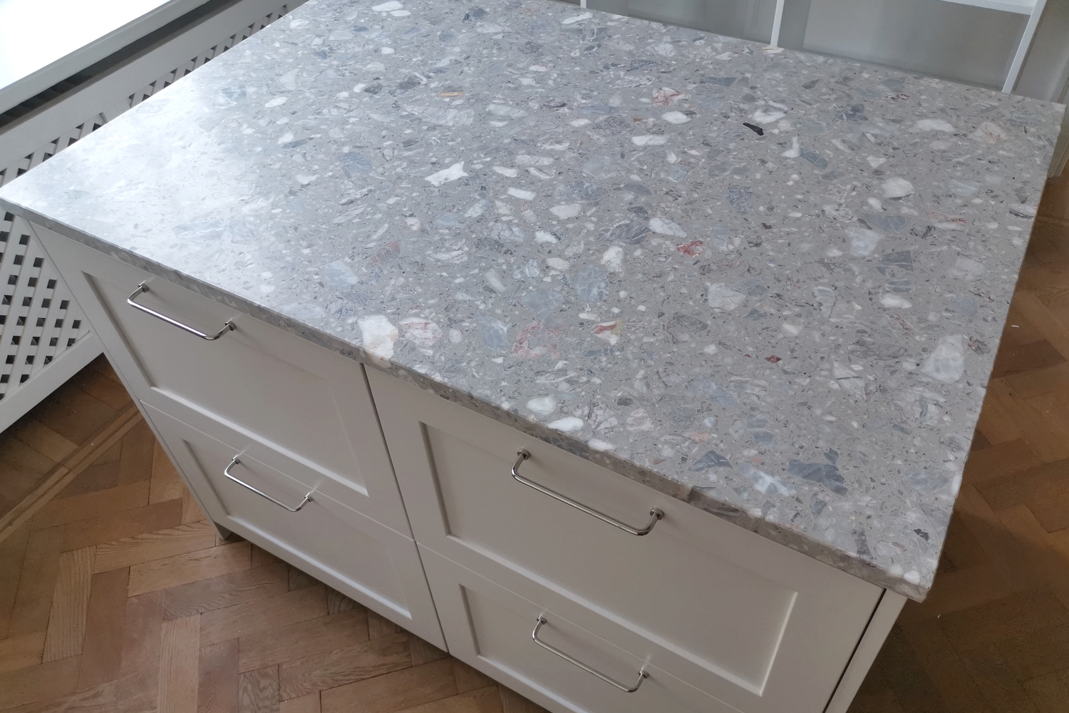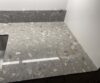 Terrazzo Fior Di Pesco är en grå konstgjord sten, terrazzo tillverkad av flisor av natursten, där harts har använts som bindemedel.
