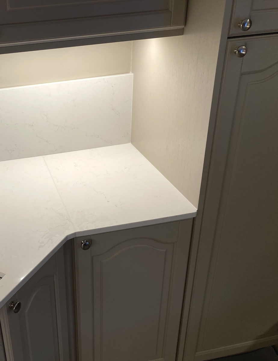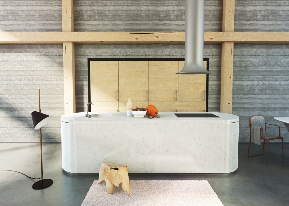 Halvrund kant (R15) är rundad upptill och rak undertill, vilket ger en mjuk och skyddande profil. Den är både funktionell och estetiskt tilltalande. Endast 20 mm och tjockare bänkskivor.