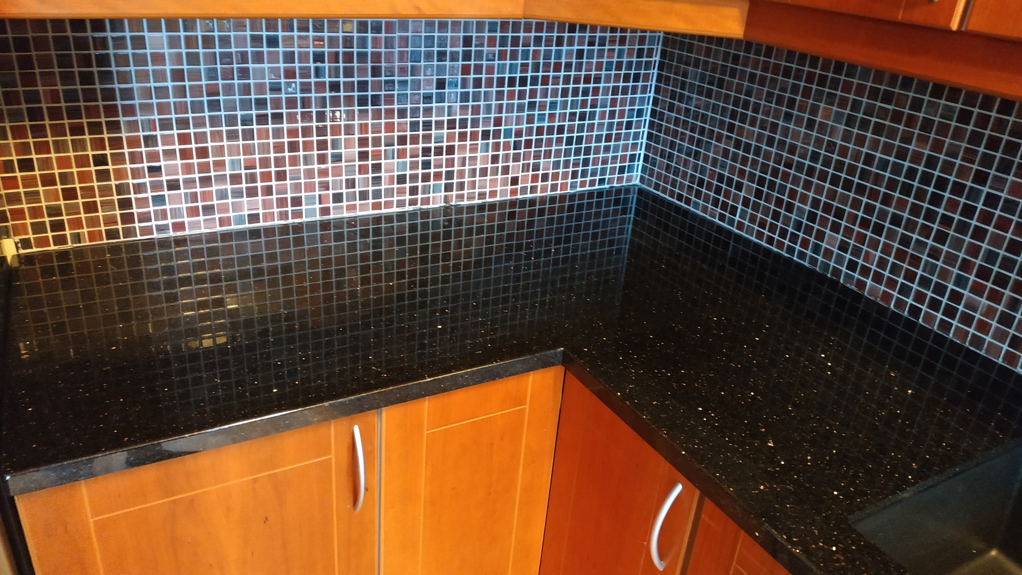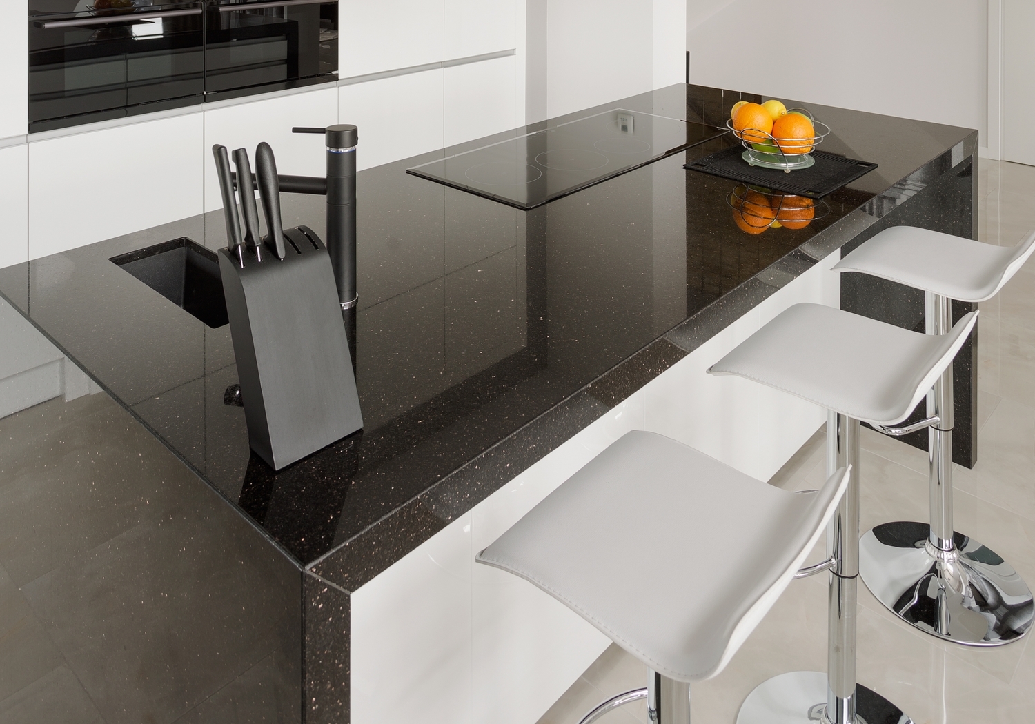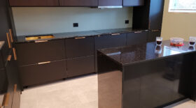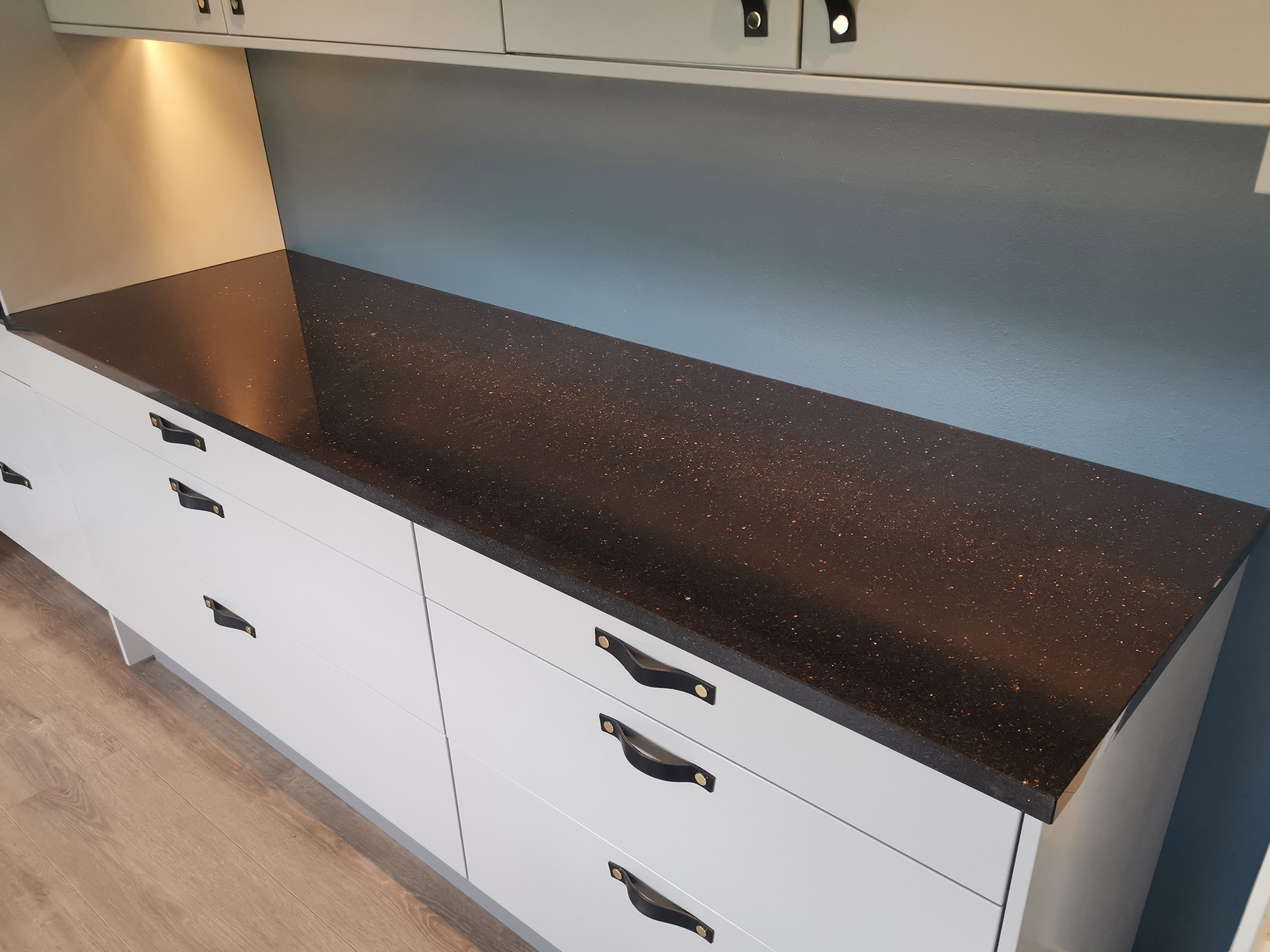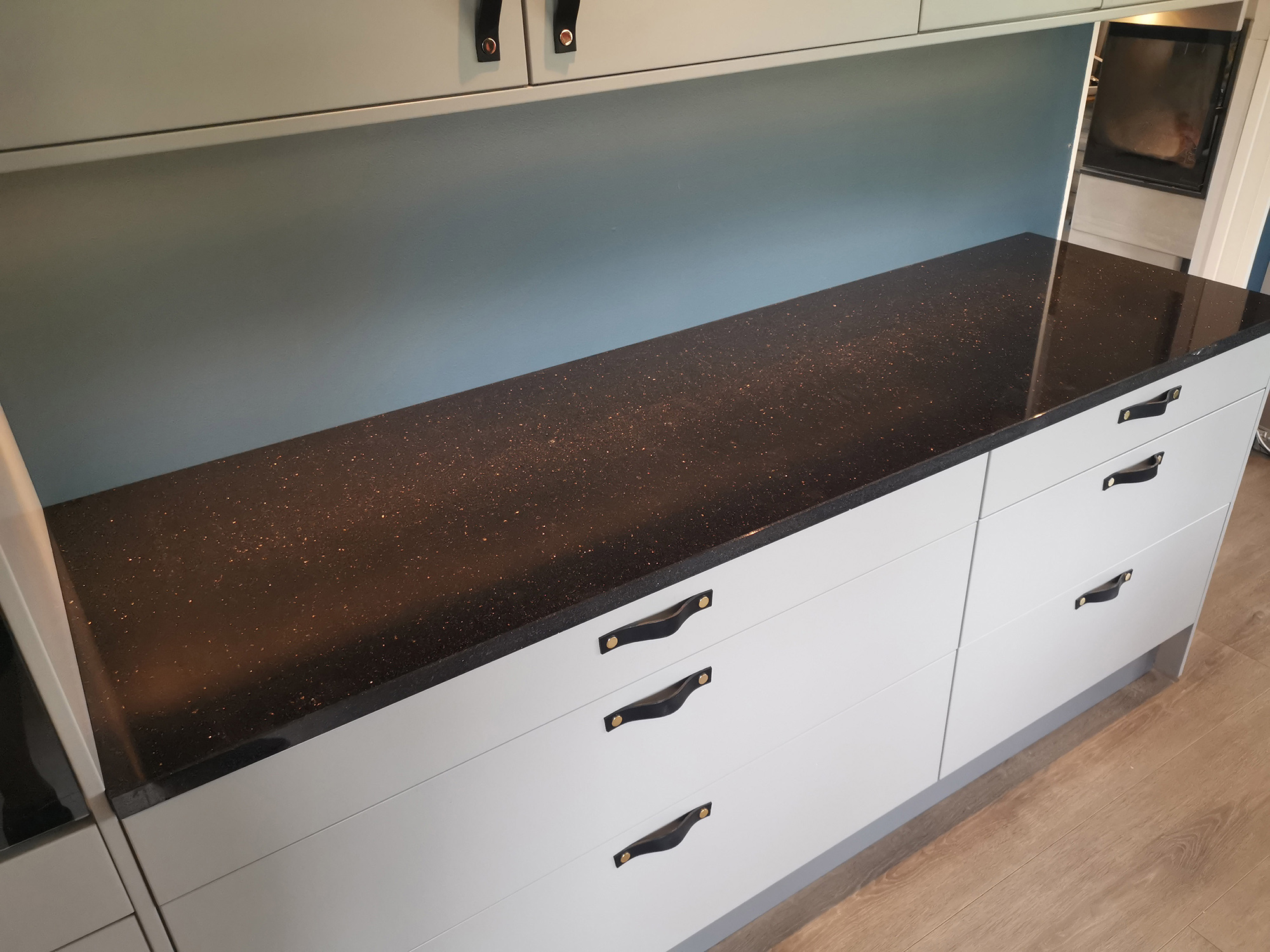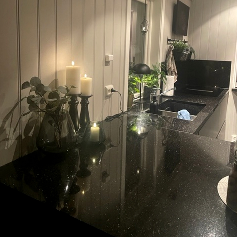 Den blanka graniten med kopparstänk gör bänkskivor av Galaxy Star till en iögonfallande syn och de passar perfekt tillsammans med moderna guld- eller silverfärgade köksmaskiner.