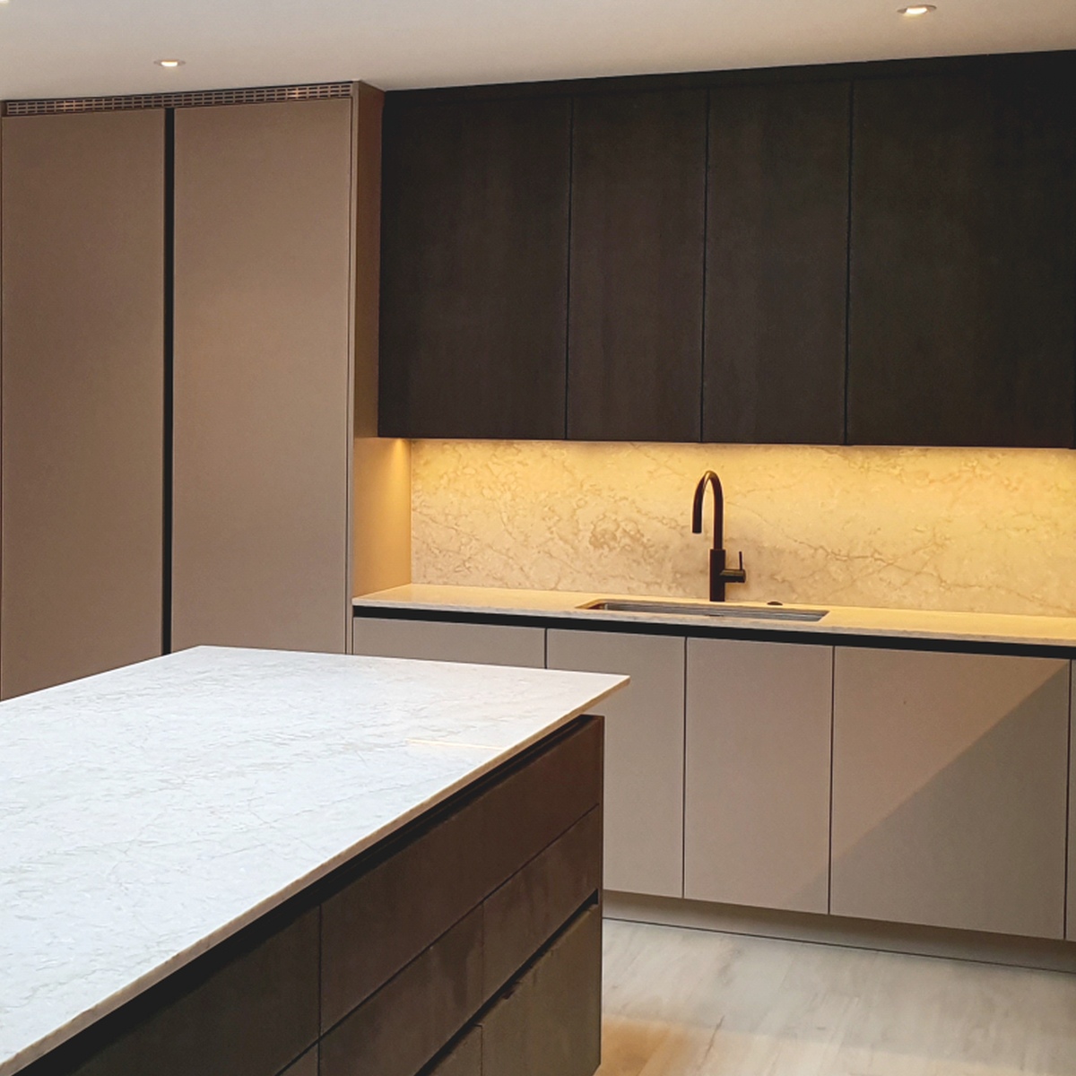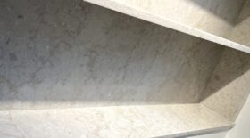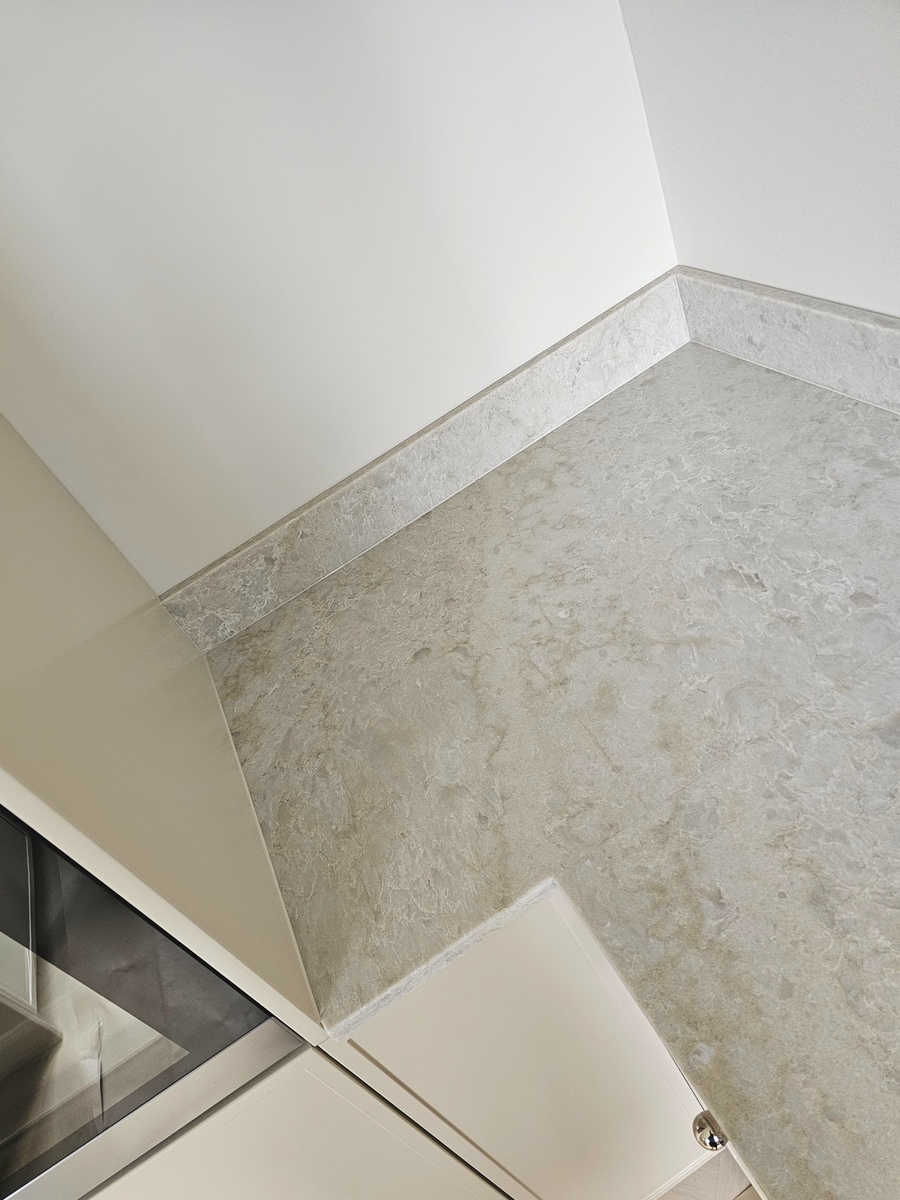 En slipad yta är också helt slät, men till skillnad från den polerade ytan har den en matt eller sidenmatt finish. Den reflekterar ljuset mjukt och diffust, vilket ger ett lugnare, mer dämpat och naturligt intryck. Slipade ytor är ofta mer förlåtande mot vardagligt slitage; fingeravtryck, damm och mindre repor tenderar att synas mindre tydligt. Den upplevs generellt som lättare att underhålla än en polerad yta.