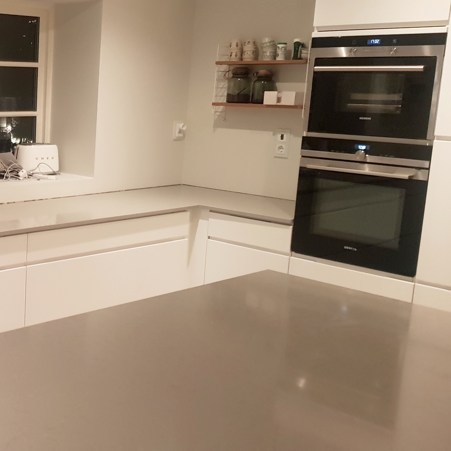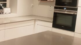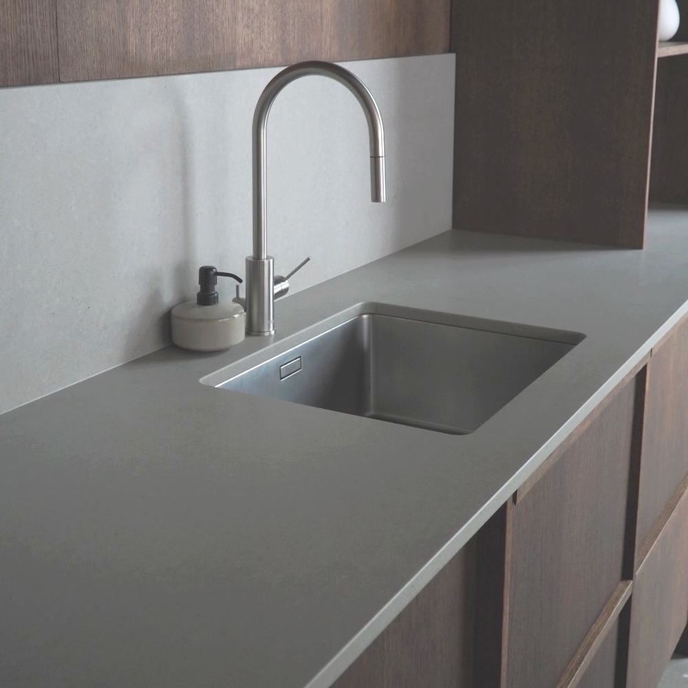 Noble Concrete Grey är kalkstensliknande kompositsten i betonggrå färg. Kompositstenskivor i Noble Concrete Grey material är starka, hållbara och extremt hygienisk! Den grå färgen ger köket en modern och lugn bakgrund och förhöjer alla andra föremåls djärvare färger.