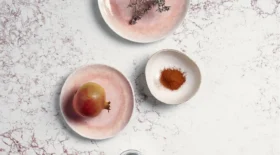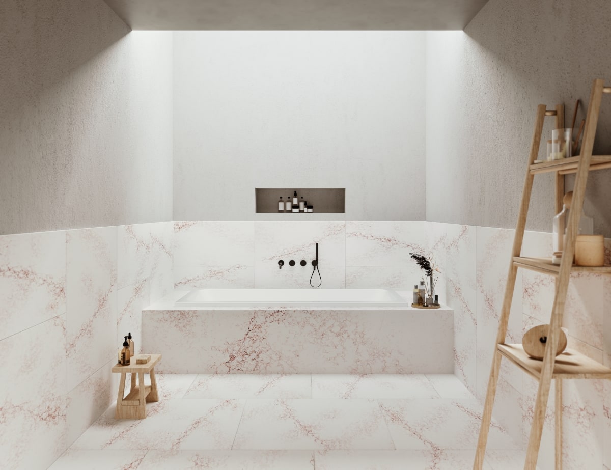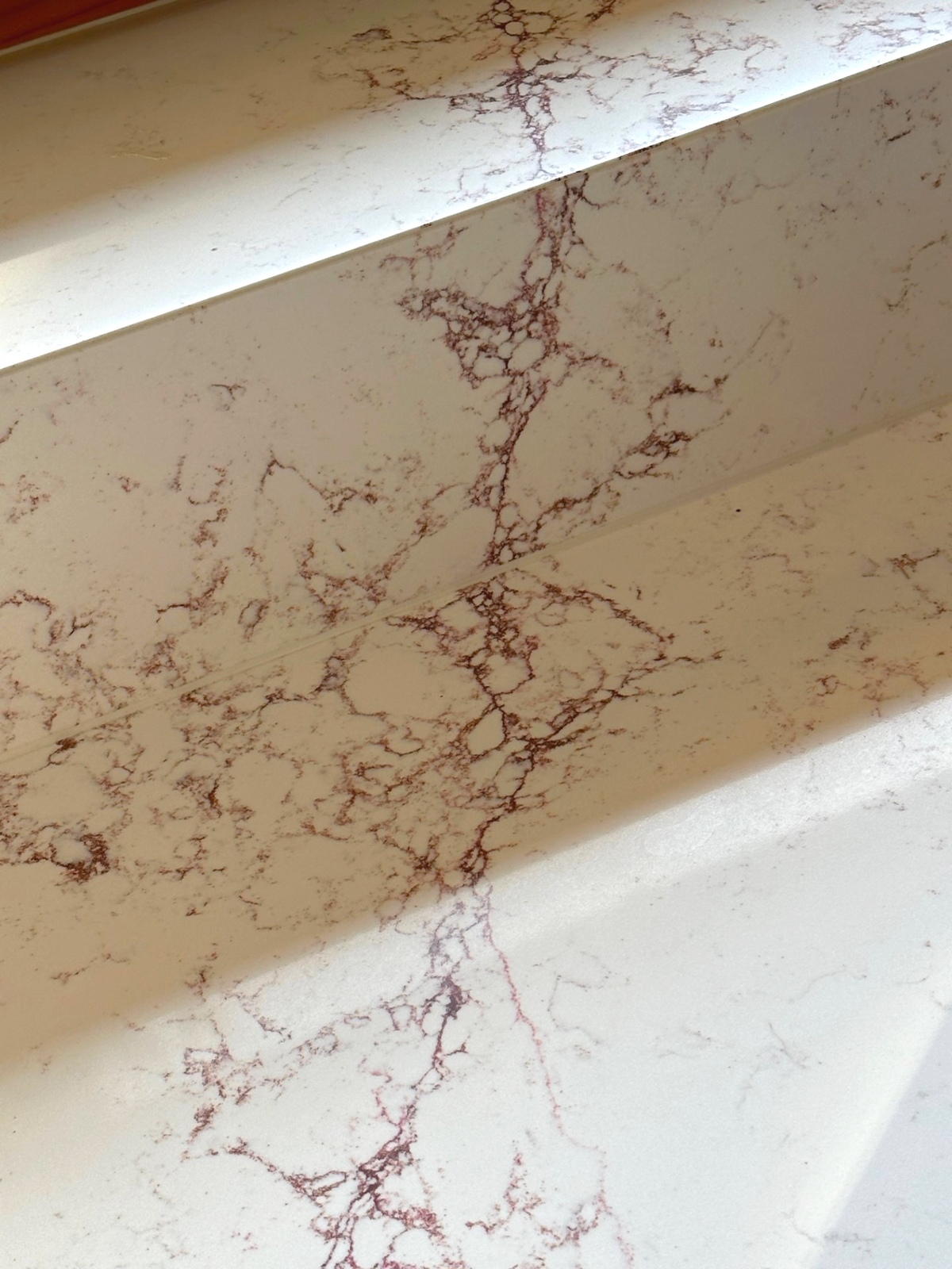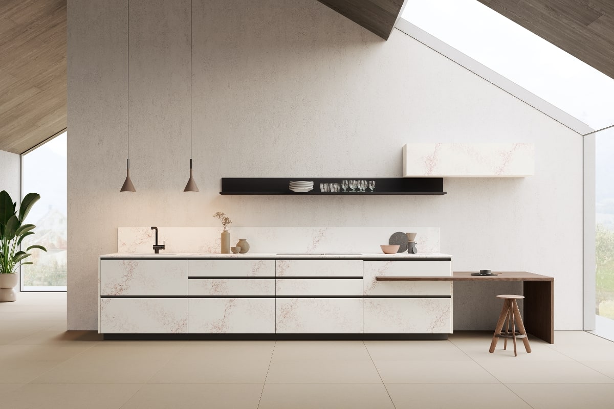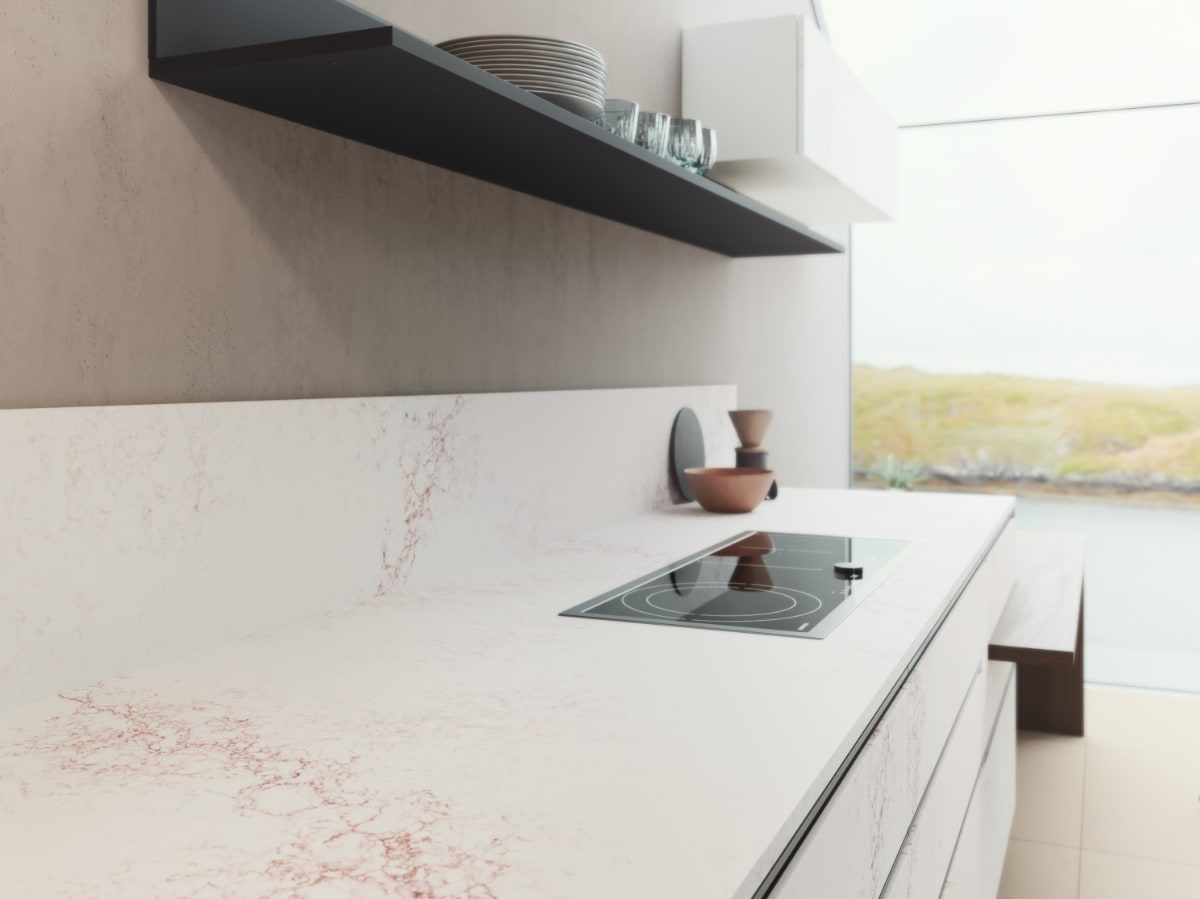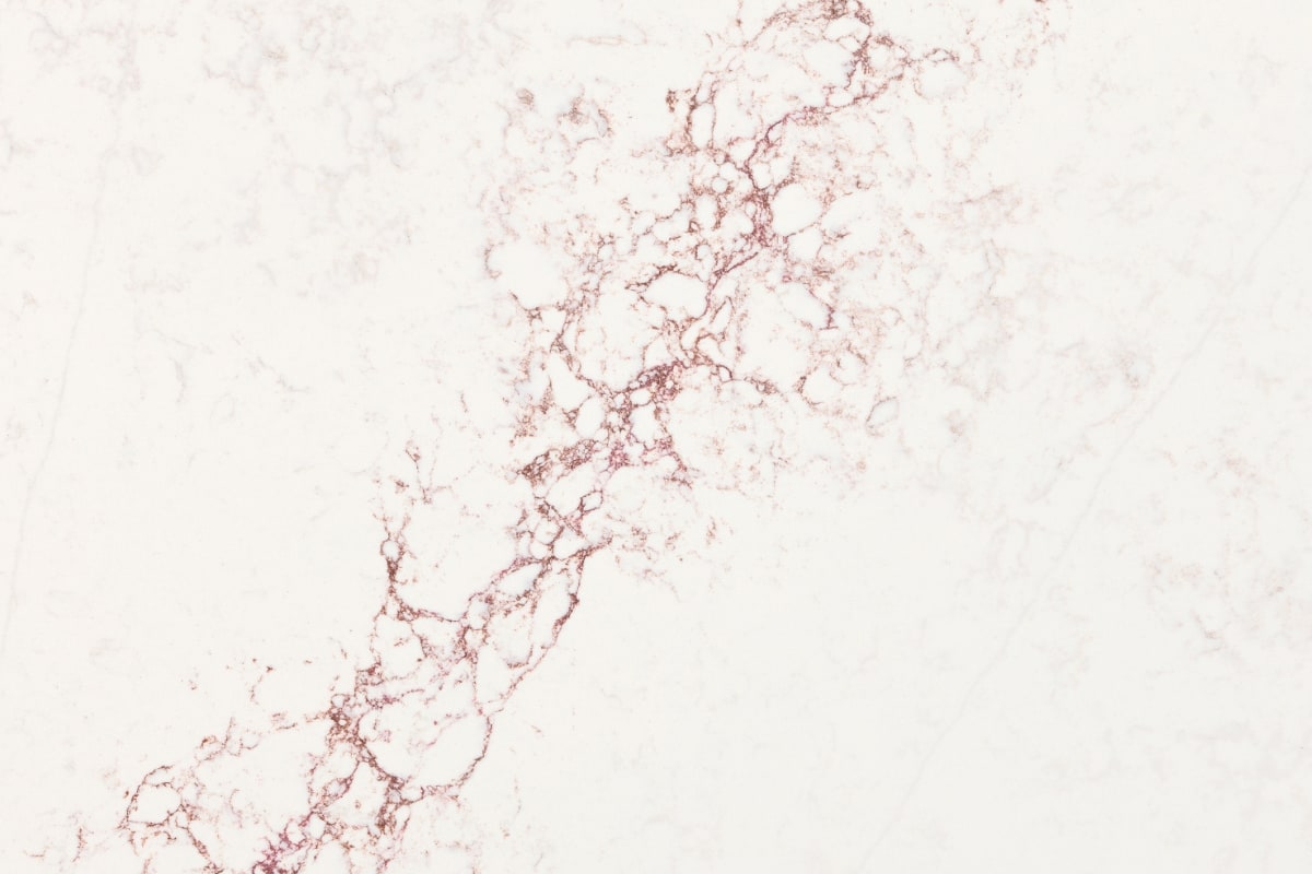 När man utformade denna kvartssten har man använt ren kvarts, strukturell polyesterharts samt UV-ljuståliga färgpigment. På det sättet har man fått en sten, jämnt tonad i vitt, vars mörkröda strängar i ytan och guldskimrande ljusgrå trådar ger ett spännande och medryckande intryck.