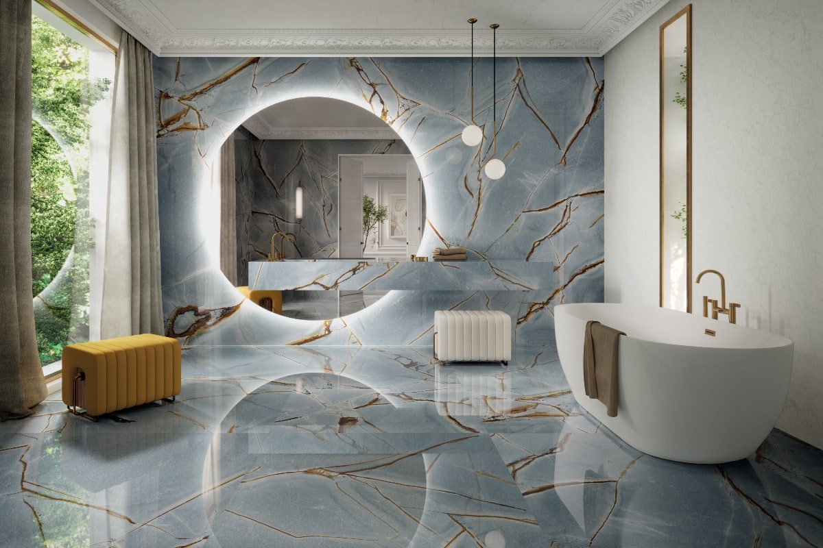 Porcelanosa Blue Roma – en keramik med ett ögonfägnande mönster, som andas styrka och hållbarhet. Bronsfärgade linjer har tecknats på Blue Romas yta och liknar kvartsit med samma namn som finns naturlig. Blue Roma med sitt smakfulla och naturliga ytmönster är som ett konstverk som livar upp varje bostads- eller affärslokal.