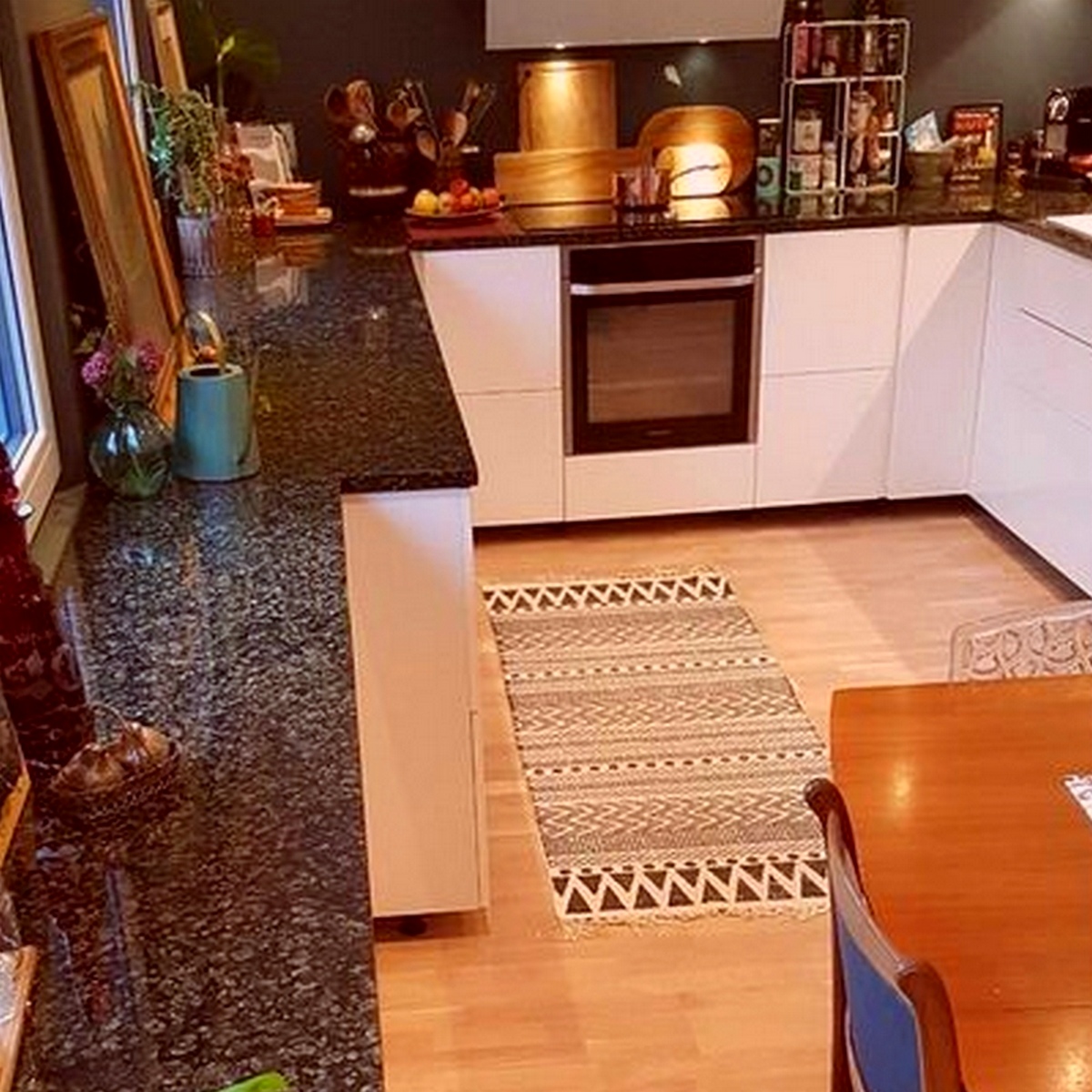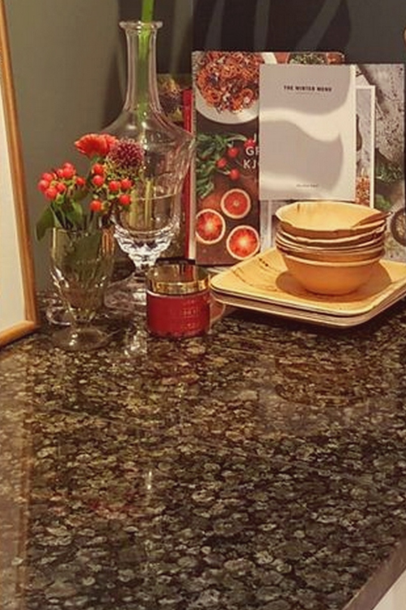 Granitskivor i Tan Brown fungerar bra tillsammans elfenbensvita, beigefärgade eller gräddvita skåpluckor men passar också bra till moderna blanka, matt lattefärgade eller cappuccinofärgade skåpluckor. Granit är ett naturligt material och det fungerar bra med andra naturliga material, så det kan även matchas med träluckor. Det är ett intressant mönster som ger liv till stora kök där enfärgad granit skulle se tråkigt ut.