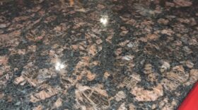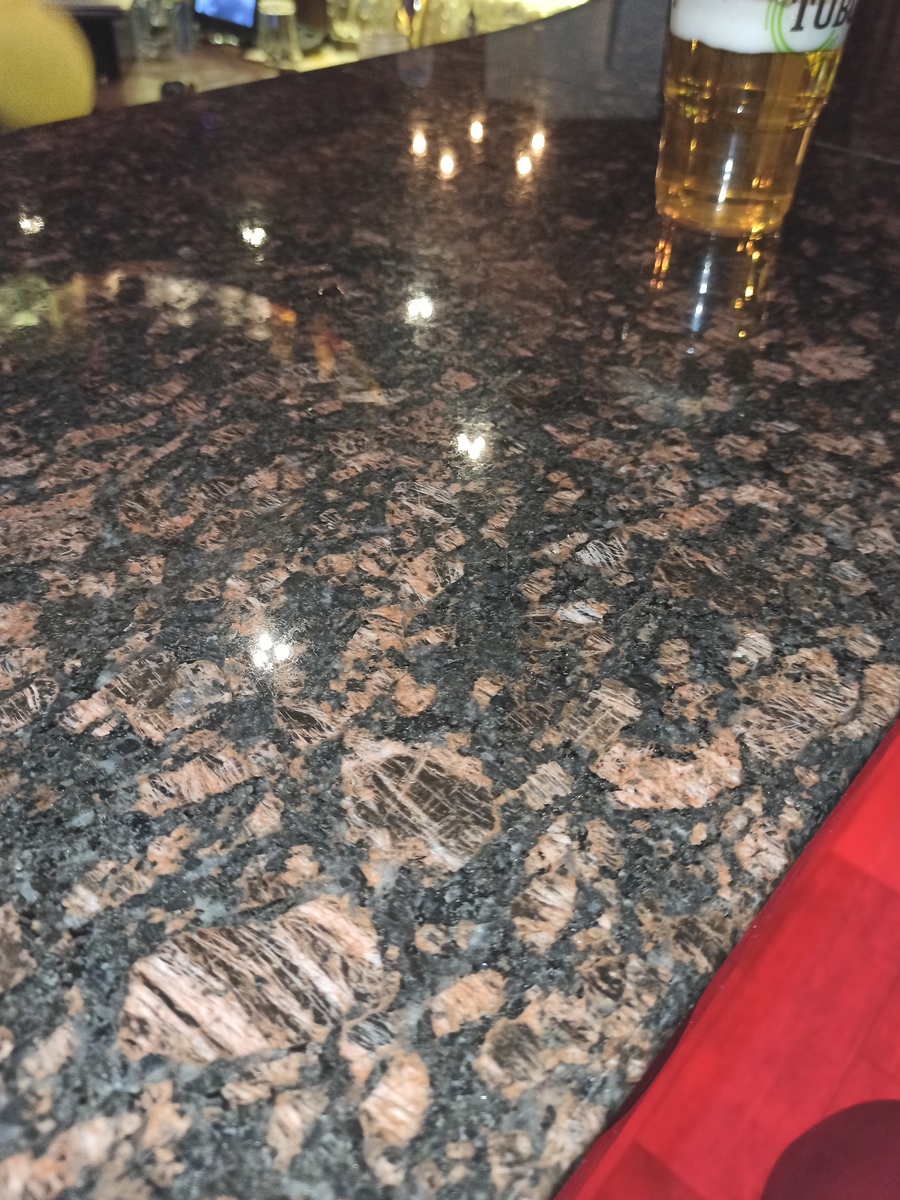 Bänkskivor i graniten Tan Brun har svart bakgrund samt grå och rödbruna kristaller. De grå kristallerna är genomskinliga och ger bänkskivan ett tredimensionellt utseende. De rödbruna ”blommorna” är elliptiska och skapar ett starkt mönster på en rik bakgrund.