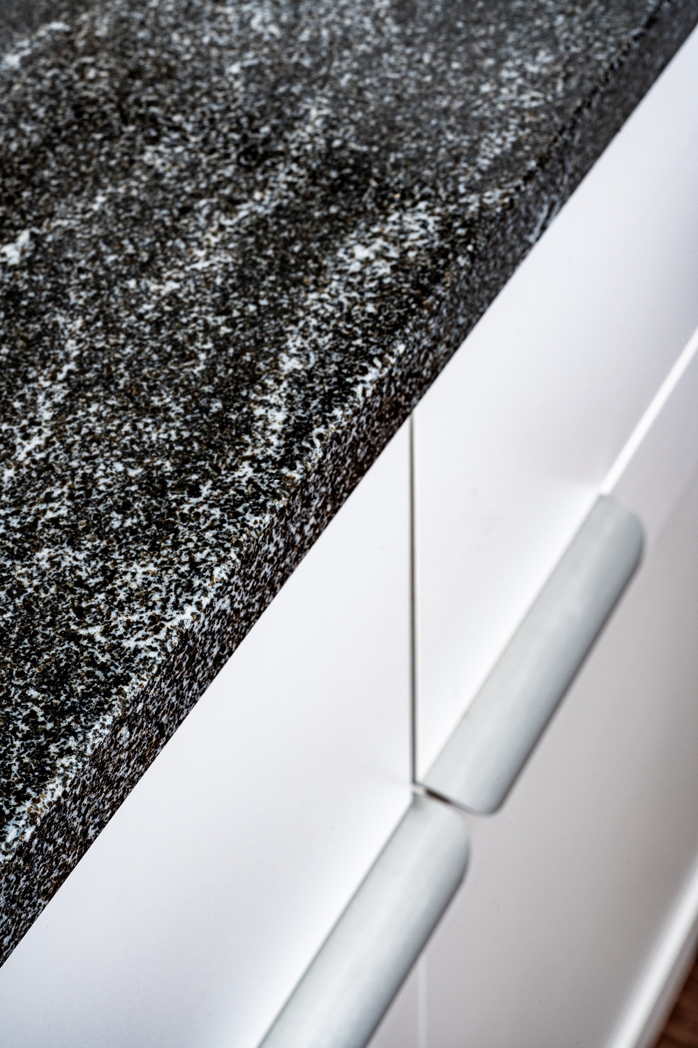Helrund kant (R15) är helt rundad och ger en mjuk och säker finish. Den är lätt att rengöra och passar särskilt bra i familjekök. Endast 30 mm och tjockare bänkskivor.