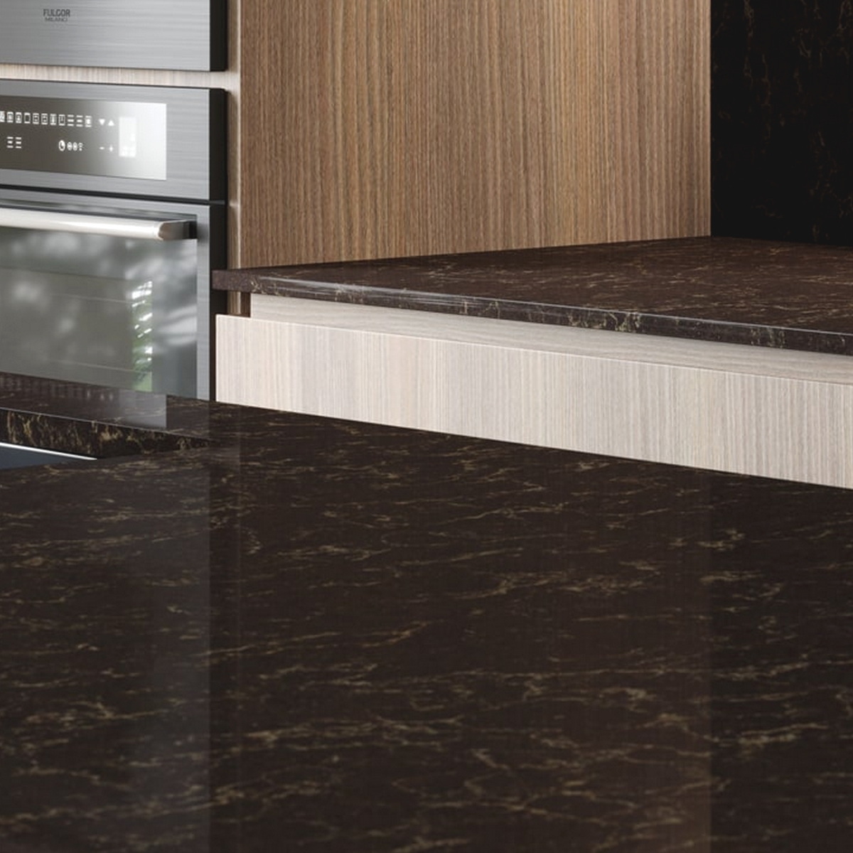 Woodlands är en naturlig kvarts i Supernatural-kollektionen och den påminner om mörkare marmor. Mot dess chokladfärgade bakgrund dansar ljusa, fint tecknade ådror.