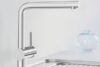 Urvalet av blandare inkluderar duschhuvud (bokstaven S i produktnamnet), blandare som kan sänkas ner i bänkskivan (F) och blandare med diskmaskinskran (A). För ett ännu mer elegant resultat föreslår vi tvålpumpar som integreras i bänkskivan och som kan användas för lagring av diskmedel eller flytande tvål.