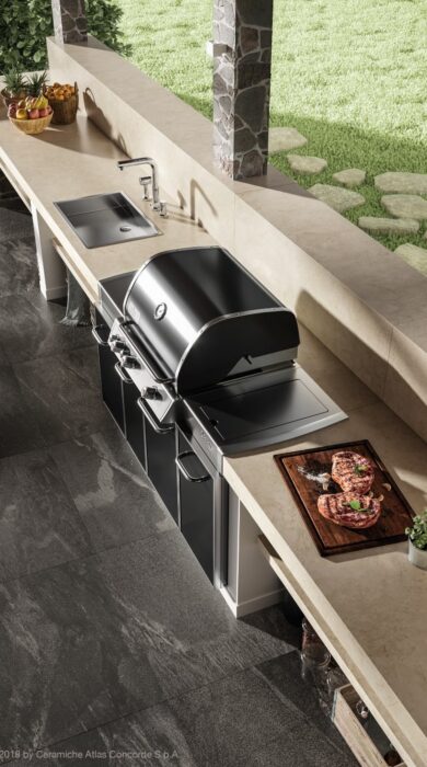 Grillen är hjärtat i köket och du kan välja mellan gas- eller kolgrill. För gasgrillar rekommenderas fast installation i underlaget av säkerhetsskäl. Kolgrillarna bör placeras på säkert avstånd från brandfarliga material. Gasgrillens enkelhet och smidiga hantering gör den till ett utmärkt val för vardagsmiddagar under sommaren och för att verkligen få ut det mesta av den fria luften.